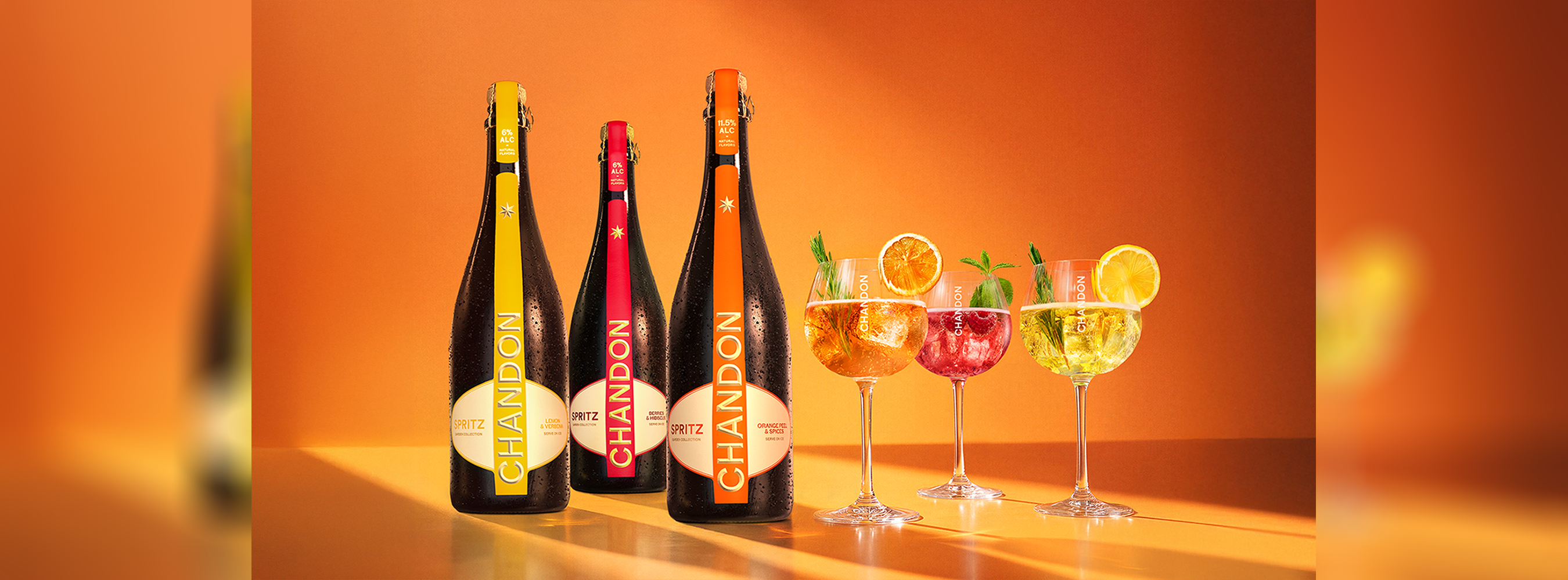 Avec le lancement de la nouvelle collection CHANDON Spritz, c’est un trio de cocktails prêts à servir et un éventail de saveurs et d’intensités qui est proposé aux consommateurs. Trois recettes élaborées à partir d’extraits d’écorces d’agrumes et d’extraits de fruits rouges, du subtil et délicatement amer Orange Peel & Spices à 11,5 % vol., aux aromatiques et acidulés Berries & Hibiscus et Lemon & Verbena, tous deux à 6 % vol. Nos œnologues se sont chargées de l’élaboration des cocktails, à chacun d’ajouter trois ou quatre glaçons. Nos spritz sont prêts à être dégustés.