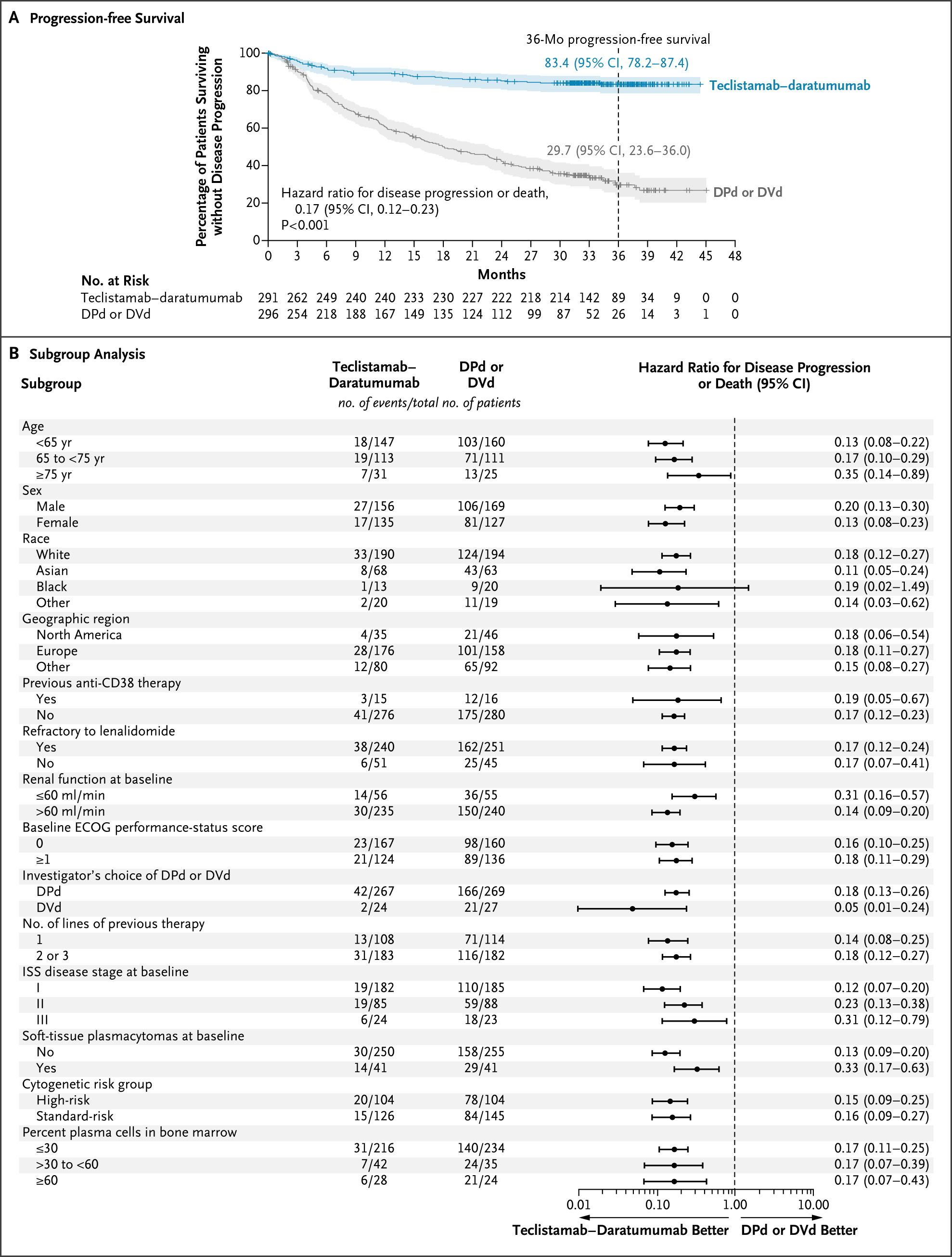 Significant improvements compared to SOC were observed across key secondary endpoints, including treatment response rates, minimal residual disease (MRD)-negativity, OS, and time to worsening of symptoms – revealing the impact of the regimen across varied patient measures.3 TECVAYLI® plus DARZALEX FASPRO® showed higher rates of overall response (ORR) (89.0% vs. 75.3%; OR, 2.65; 95% CI, 1.68-4.18), complete response (≥CR) (81.8% vs. 32.1%; odds ratio [OR], 9.56; 95% CI, 6.47-14.14), and MRD-negativity (58.4% vs. 17.1%; OR, 6.78; 95% CI, 4.53-10.15, P<0.0001; evaluable rate of 89.3% vs. 63.0%) at three-years follow-up.3 OS favored TECVAYLI® plus DARZALEX FASPRO® (HR, 0.46; 95% CI, 0.32-0.65; P<0.0001) across all prespecified subgroups. At three years, OS rates were 83.3% and 65.0% for the TECVAYLI® plus DARZALEX FASPRO® arm and the control arm, respectively.3