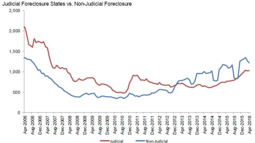 This report separates state data into judicial versus non-judicial foreclosure state categories. In judicial foreclosure states, lenders must provide evidence to the courts of delinquency in order to move a borrower into foreclosure. In non-judicial foreclosure states, lenders can issue notices of default directly to the borrower without court intervention. This is an important distinction since judicial states, as a rule, have longer foreclosure timelines, thus affecting foreclosure statistics.