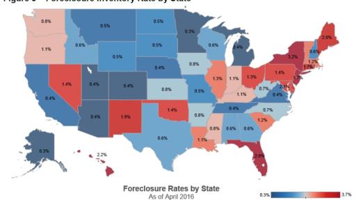- On a month-over-month basis, the foreclosure inventory was down 3 percent compared with March 2016.