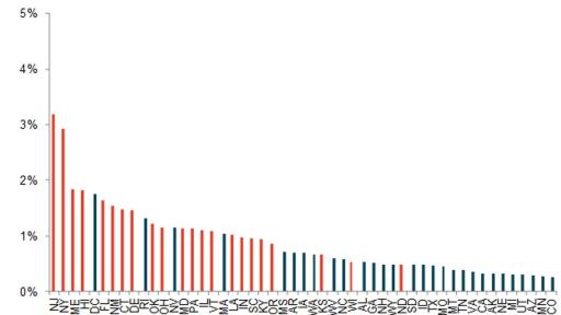 - Four states and the District of Columbia had the highest foreclosure inventory rate in August 2016: New Jersey (3.2 percent), New York (2.9 percent), Maine (1.8 percent), Hawaii (1.8 percent) and the District of Columbia (1.8 percent).