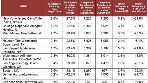 - On a month-over-month basis, the August 2016 foreclosure inventory was down 3.2 percent compared with July 2016.