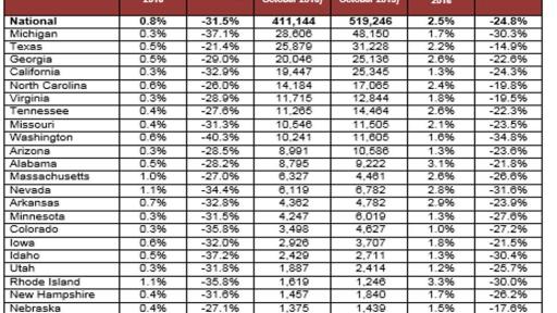 - The five states with the highest number of completed foreclosures in the 12 months ending in October 2016 were Florida (51,000), Michigan (29,000), Texas (26,000), Ohio (23,000) and Georgia (20,000).These five states accounted for 36 percent of completed foreclosures nationally.