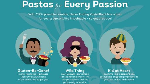 Never Ending Pasta Bowl includes options to please the entire family with more than 200 possible combinations of specialty pastas, homemade sauces and craveable toppings: