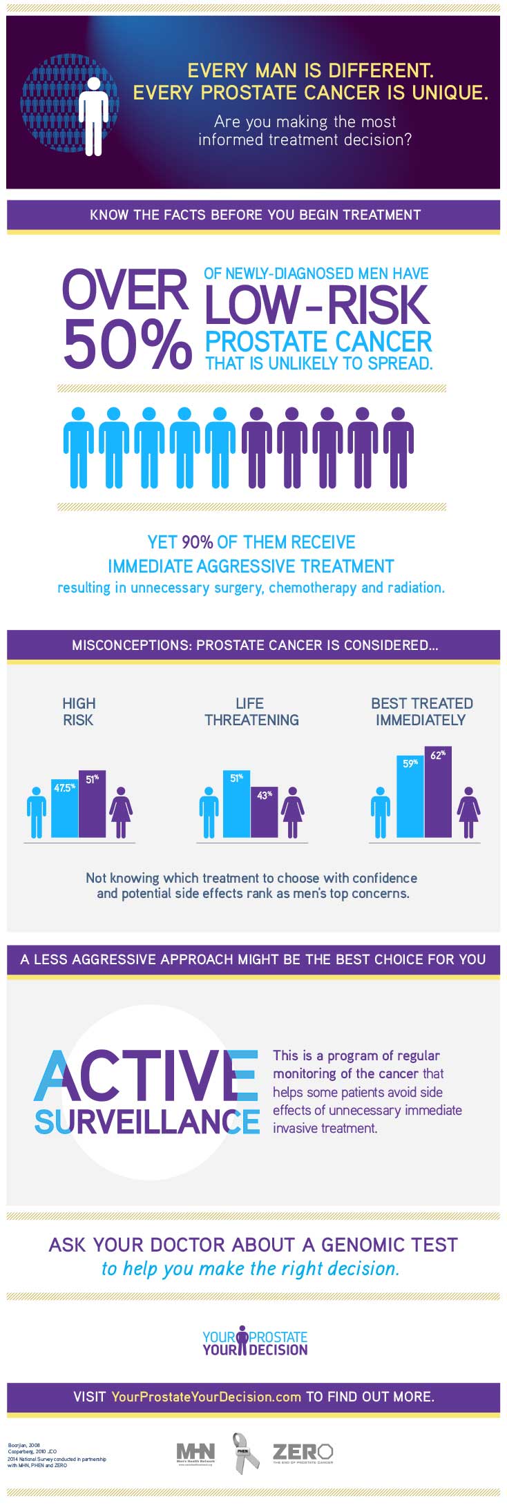A large national survey conducted by Kelton, a large independent research firm, and supported by MHN, PHEN, ZERO and Genomic Health, revealed that general awareness around prostate cancer aggressiveness and treatment options is low. This first-ever survey of public perception of prostate cancer aggressiveness and treatment, which included 616 men age 50 and over and 222 women who care for at least one man age 50 and over, revealed: