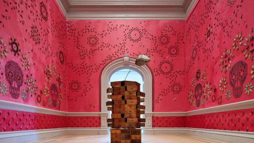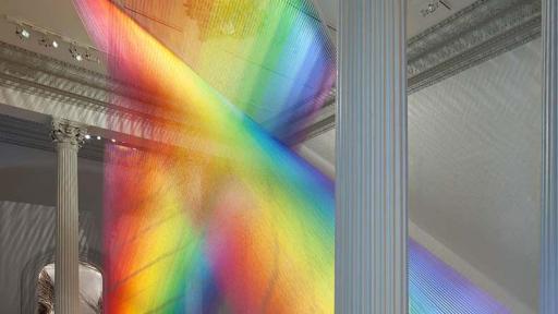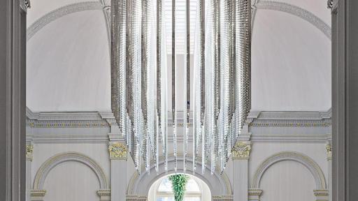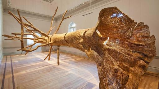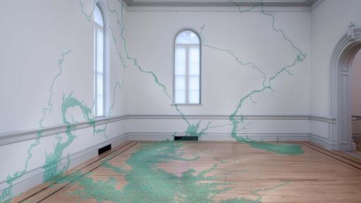 Works by Angus, Booker, Echelman, Grade, Lin and Villareal will be installed on the second floor. Angus covers gallery walls in spiraling, geometric designs reminiscent of wallpaper or textiles but made using specimens of brightly colored insects. Booker works with discarded rubber tires, splicing and weaving them into an enormous labyrinth. Echelman explores volumetric form without solid mass, overtaking the museum’s famed Grand Salon with a suspended, handwoven net surging across its 100-foot length. Grade uses 500,000 pieces of reclaimed cedar to reconstruct a hemlock tree approximately the same age as the Renwick’s building, based on a complete plaster cast he made of the tree in situ in the Cascade Mountains. Lin’s deluge of green marbles flows across the floor and up walls, recalling the flow of the Chesapeake Bay as part of her investigation into the fluidity of natural forms in her artworks. Villareal’s installation—320 steel rods embedded with 23,000 LEDs programmed to display a code written and manipulated by the artist into endless variations—will be mounted above the Renwick’s Grand Staircase.
