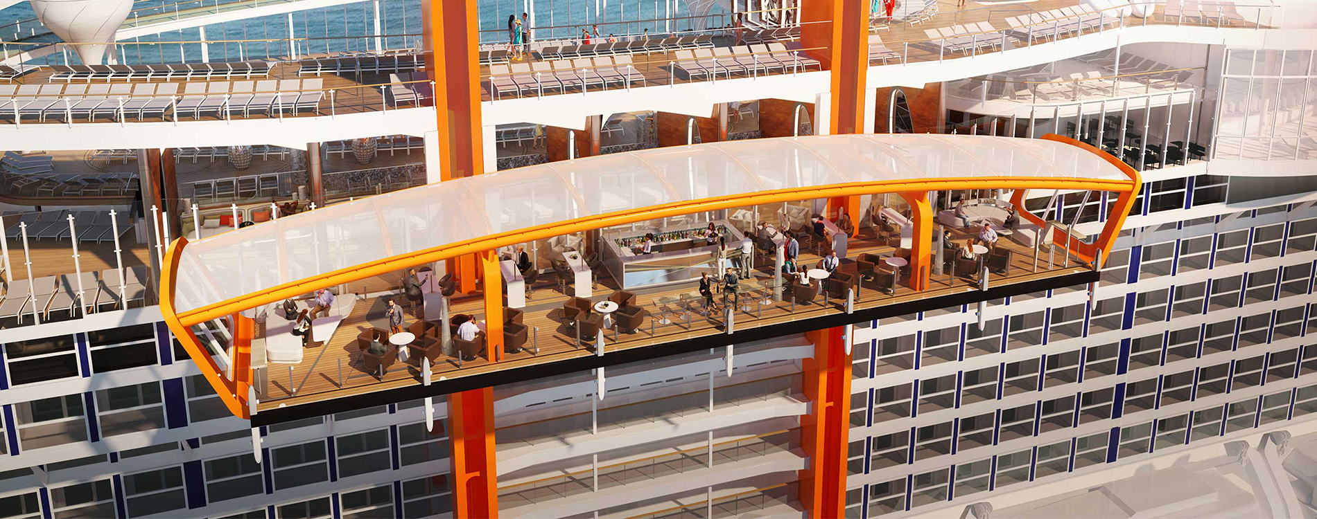 At the summit of the ship on Deck 16, the Magic Carpet becomes the ultimate specialty restaurant offering a special “Dinner on the Edge” for 90 guests. Alongside Deck 14, Magic Carpet becomes an open-air expansion of the main pool area. On Deck 5, Magic Carpet extends one of the ship’s specialty restaurants into the most amazing al fresco seating imaginable, and at its lowest position on Deck 2, Magic Carpet is a key component to the Destination Gateway, a luxury embarkation station where guests will be whisked away aboard sleek Edge Launches.SM