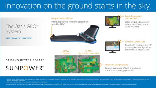 - The SunPower® Oasis GEO™ system is a groundbreaking component of the Oasis platform that automates project design using drones and proprietary software. Thousands of designs are generated and evaluated by the software, based on site data gathered by the drones, and designs that best serve the customer’s financial and energy goals are recommended. Developers can screen a large number of potential sites quickly using the cloud-based computing platform and owners can be assured that projects have been fully optimized for profitability and lowest cost of energy (LCOE) versus conventional manual-based approaches to project design and development.