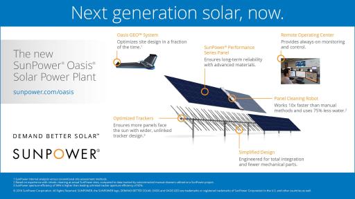 “The Oasis platform is a complete solution that optimizes energy production and maximizes value for our power plant customers,” said Tom Werner, president and CEO of SunPower. “Integral to each Oasis component, from the automated design tools to robotic panel cleaning, is more than 30 years of solar industry innovation and experience that only SunPower offers, enabling our customers to benefit from the world’s most efficient, reliable solar technology available.”