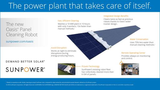 - Soiling can be a leading source of potential revenue loss for power plant owners. SunPower utilizes proprietary robotic panel cleaning technology at its power plants that uses 75 percent less water than manual cleaning methods and operate at night to avoid disrupting daytime energy production. Robots under development for use with the third-generation Oasis platform are expected to have the capability to clean ten megawatts of panels in ten hours with three workers, twice as fast as the company’s current robotic cleaning technology, and ten times faster than manual cleaning methods used by competitors.