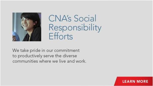 Serving businesses and professionals since 1897, CNA is the country’s eighth largest commercial insurance writer and the 14th largest property and casualty company. CNA’s insurance products include standard commercial lines, specialty lines, surety, marine, and other property and casualty coverages. CNA's services include risk management, information services, underwriting, risk control and claims administration. For more information, please visit CNA at www.cna.com.