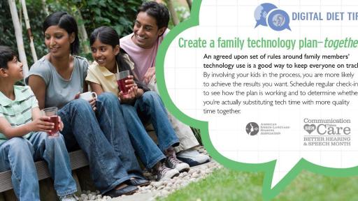 ASHA experts are urging parents and teens to adopt a new “Digital Diet” to help moderate tech use in favor of more conversation and human interaction. Tips include creating a family technology plan, keeping a log, or sponsoring tech-free nights and events.