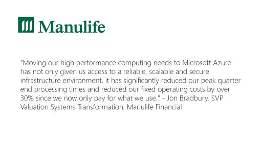 Many Canadian customers and partners are already powered by the Microsoft Cloud. These customers include Manulife Financial; one of Canadas leading financial services companies whose mandate is to provide forward thinking solutions to help people with their big financial decisions. They describe their move to the Microsoft Cloud as follows: “Moving our high performance computing needs to Microsoft Azure has not only given us access to a reliable, scalable and secure infrastructure environment, it has significantly reduced our peak quarter end processing times and reduced our fixed operating costs by over 30% since we now only pay for what we use.”