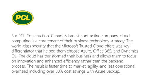 Today’s announcement in Canada brings the total number of generally available Azure regions to 24 globally, more than any other cloud provider, all backed by a $15 billion (USD) investment in global datacentre infrastructure. This enables customers like PCL, Canada’s largest contracting company, to have a unified infrastructure in all the countries they operate. The cloud has transformed their business and allows them to focus on innovation and enhanced efficiency rather than the backend process. The result is faster time to market, agility, and less operational overhead including over 80% cost savings with Azure Backup.
