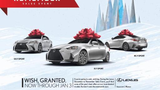 The December Sales Event offers incentives through Jan. 3, 2017. To view the spots, visit YouTube.com/Lexus.
