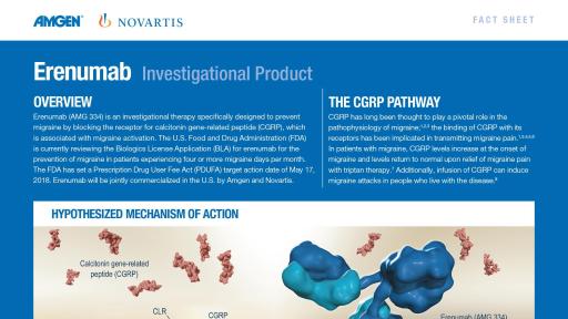 Aimovig is the only treatment specifically designed to prevent migraine by blocking the CGRP receptor, which is associated with migraine activation. Aimovig has been studied in several large global, randomized, double-blind, placebo-controlled studies to assess its safety and efficacy in migraine prevention. More than 2,600 patients have participated in the Aimovig clinical program across the four placebo-controlled Phase 2 and Phase 3 clinical studies and their open-label extensions. Regulatory submissions have been filed in the U.S. and Europe. The FDA has set a Prescription Drug User Fee Act (PDUFA) target action date of May 17, 2018.