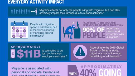 People with frequent migraine may lose more than half their life to migraine days.3 Migraine robs individuals of time with their families, productivity at home and at work, and their livelihoods. Migraine sufferers endure debilitating pain, physical impairment, and live in constant dread of the next attack – all of which is compounded by a widespread misperception of the disease.4 The World Health Organization ranks migraine as one of the most debilitating illnesses.4 For the approximately 10 million Americans whose migraine frequency or severity impacts daily activities, preventive medications may be an option.5 Approximately 3.5 million of these patients are currently on a preventive therapy, but up to 80 percent discontinue these within one year.6,7 Migraine is associated with personal and societal burdens of pain, disability, and financial cost, and it remains under-recognized and under-treated.
