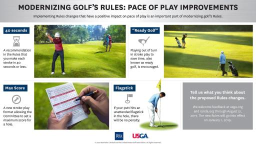- Pace-of-play support: Reduced time for searching for a lost ball (from five minutes to three); affirmative encouragement of “ready golf” in stroke play; recommending that players take no more than 40 seconds to play a stroke and other changes intended to help with pace of play.