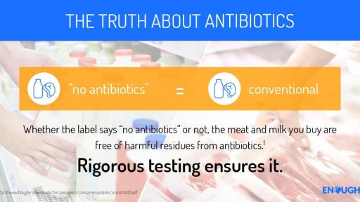- Regardless of whether an animal was sick and treated with an antibiotic or was raised entirely without antibiotics, the food you buy is free from any harmful antibiotic residue.5 Testing ensures it.