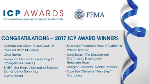 WASHINGTON –The Federal Emergency Management Agency (FEMA) announced today the winners of the 2017 FEMA Individual and Community Preparedness Awards, recognizing the lifesaving efforts of individuals and organizations from across the country who are working to prepare for emergencies. Each year, FEMA honors individuals and organizations who excel at inspiring the public to be ready if a tornado, hurricane, wildfire, or other disaster were to strike their community.