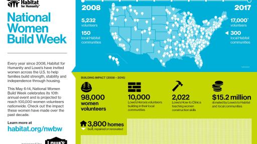 ATLANTA (May 4, 2017) – More than 17,000 women volunteers will come together starting Saturday in their local communities to help build or improve affordable homes alongside future homeowners as part of Habitat for Humanity and Lowe’s 10th annual National Women Build Week. With the help of Lowe’s Heroes volunteers, they will build or improve 600 Habitat homes in nearly 50 states in just one week.