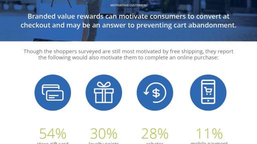 - Branded value rewards can motivate consumers to convert at ecommerce checkout. Though shoppers are still most motivated by free shipping, the shoppers surveyed reported that the following would also motivate them to complete an online purchase: a gift card to the store (54 percent), loyalty points (30 percent), rebates (28 percent) and a mobile payment option (11 percent).