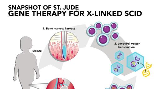 In response, St. Jude researchers have re-engineered a lentivirus to function as a vector to ferry a normal copy of IL2RG into the patients’ hematopoietic stem cells. The vector includes novel features to enhance safety and effectiveness. The features include genetic insulators to block activation of genes adjacent to the IL2RG DNA insertion site. The design aims to ensure gene therapy will not lead to leukemia by inadvertently activating an oncogene in the patient’s hematopoietic stem cells.