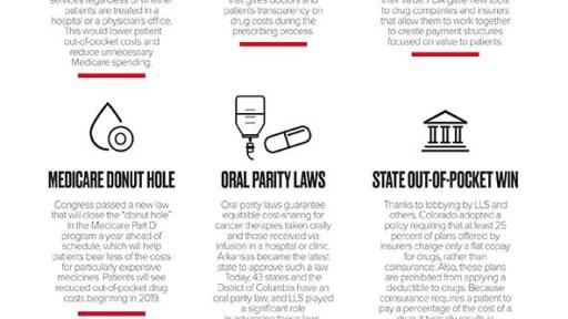 According to Gwen Nichols, M.D., LLS chief medical officer, “LLS is pushing for more relief for patients. For example, LLS is advocating for policymakers to eliminate some of the perverse payment incentives that lead hospitals to acquire private physician practices, a decision that typically hikes patient copays.”