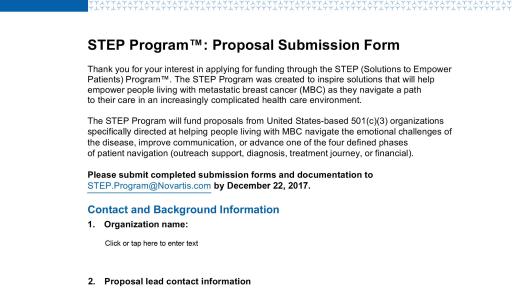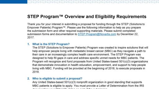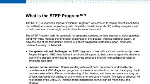The STEP Program will recognize and fund proposals that demonstrate innovation in health education, empowerment, and support to help people living with MBC.