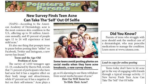 The survey was conducted online by Harris Poll on behalf of Cutanea Life Sciences, the makers of Aktipak™ (erythromycin and benzoyl peroxide), Gel, 3%/5%,3 within the United States between July 13 and 31, 2017 among 1,010 US teens aged 15-19 who are juniors or seniors in high school or freshman or sophomores in college and who attend school in the US. Figures for age within gender, race/ethnicity, and region were weighted where necessary to bring them into line with their actual proportions in the population. Teens 15-17 were also weighted by school location, parents’ highest level of education, and internet usage; teens 18-19 years old were also weighted by education. Propensity score weighting was also used to adjust for 18-19 year old teen respondents’ propensity to be online.1