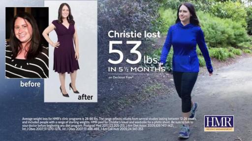 1Average weight loss for the Healthy Solutions at Home® program with phone coaching is 23 lbs. at 12 weeks and 28 lbs. at 26 weeks. Int J Obes 2007; 31:1270-1276; Obes 2013; 21:1951-1959. 2Average weight loss for the Decision-Free plan is 43-66 lbs. J Am Diet Assoc 2009;109:1417-1421;Int J Obes 2007;31:488-494;J Am Coll Nutr 2005;24:347-353. Average weight loss for the in-clinic Healthy Solutions plan is 28-37.5 lbs. J Am Diet Assoc 2009;109:1417-1421;Postgrad Med 2011;123:205-213;Int J Obes 2007;31:1270-1276;Obes 2013;21:1951-1959. These studies were supported and/or sponsored by HMR, including financial support in some cases. Some of the investigators in some of the studies were employees of HMR and/or members of the HMR Medical Advisory Board.