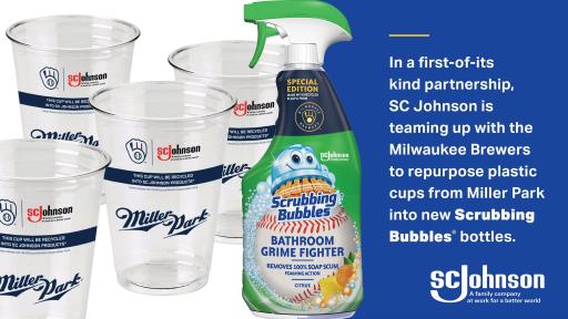 Starting with the 2020 season, fans at Miller Park will be able to place plastic drink cups branded with the SC Johnson logo in specially designed receptacles to separate them from other waste. SC Johnson will collect the cups and use the recycled plastic in Scrubbing Bubbles® bottles.