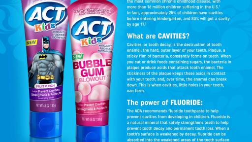 "Hacer que los hijos se cepillen los dientes bien y con frecuencia, puede ser una lucha desafiante para los padres, pero es increíblemente importante para la prevención de las caries", sostuvo Paul H. Carico, III, doctor de Cirugía Dental del Centro para la Odontología Integral de Chattanooga. "Gracias a los sabores que los niños disfrutan y el poder del fluoruro, que de manera segura fortalece los dientes y previene su deterioro, los padres pueden confiar en ACT Kids Toothpaste como una nueva opción para ayudar a sus hijos a mantener una sonrisa limpia y sana".