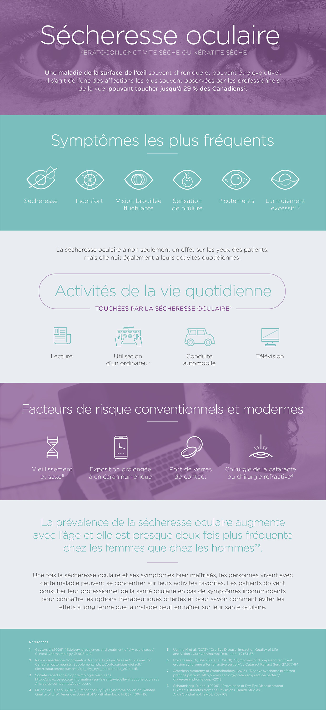 La sécheresse oculaire est l’une des maladies les plus souvent observées par les professionnels de la vue et peut toucher jusqu’à 29 % des Canadiens5. Cette affection a des répercussions importantes sur la qualité de vie liée à la vision et peut nuire aux activités comme lire, utiliser un ordinateur, conduire une automobile et regarder la télévision6.