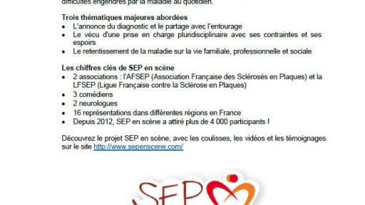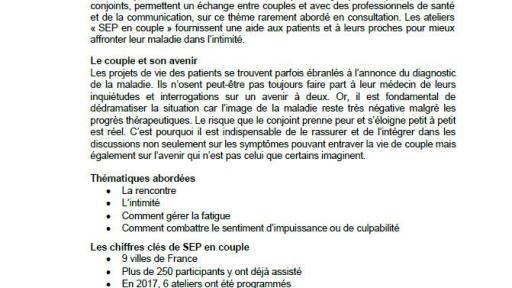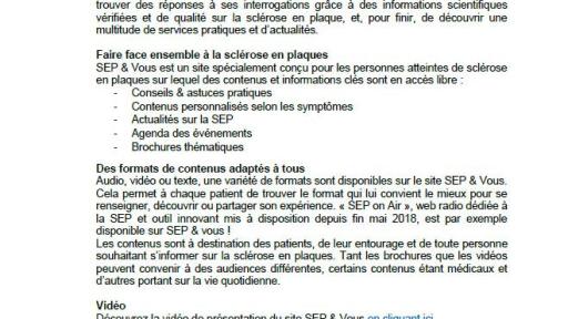 Depuis plus de 5 ans, Novartis met à disposition des services et des outils permettant d’aborder toutes les facettes de la sclérose en plaques : la vie amoureuse et sexuelle avec les ateliers « SEP en couple », le regard des enfants sur la maladie d’un parent avec l’application « Professeur Fizzgobble » (disponible sur tablettes), le libre parler avec les représentations « SEP en scène ». Le site internet « SEP et vous » est un guide complet d’informations interactives pour les patients, leurs proches mais aussi les professionnels de santé. Certaines thématiques spécifiques sont approfondies grâce aux brochures « PerSEPtions » et « MultiSEP ». Enfin, l’application mobile « SEP agenda » accompagne le patient dans son quotidien avec la maladie.
