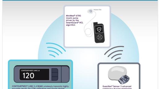 The CONTOUR®NEXT LINK 2.4 BGMS was designed to wirelessly transmit highly accurate blood glucose results for CGM calibration and insulin dosing as part of the MiniMed® 670G system. The CONTOUR®NEXT LINK 2.4 BGMS automatically sends blood glucose results into the Bolus Wizard® calculator, allowing patients to discreetly give a bolus of insulin remotely from the meter, providing added convenience for patients.1
